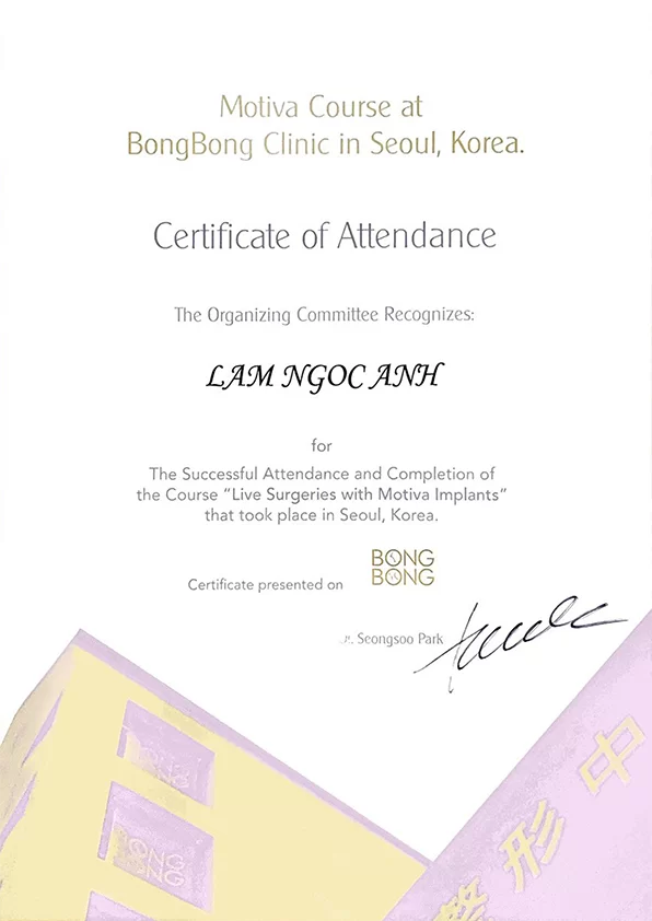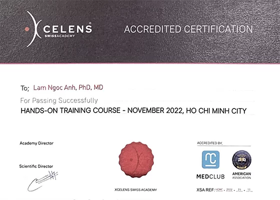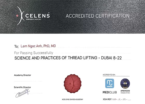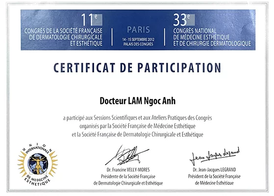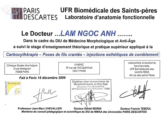 + 2008 – 2009: học và thực hành Thẩm mỹ Nội Khoa tại Pháp với GS Morin (Paris, Pháp) và GS Morel (Bordeaux – Pháp).