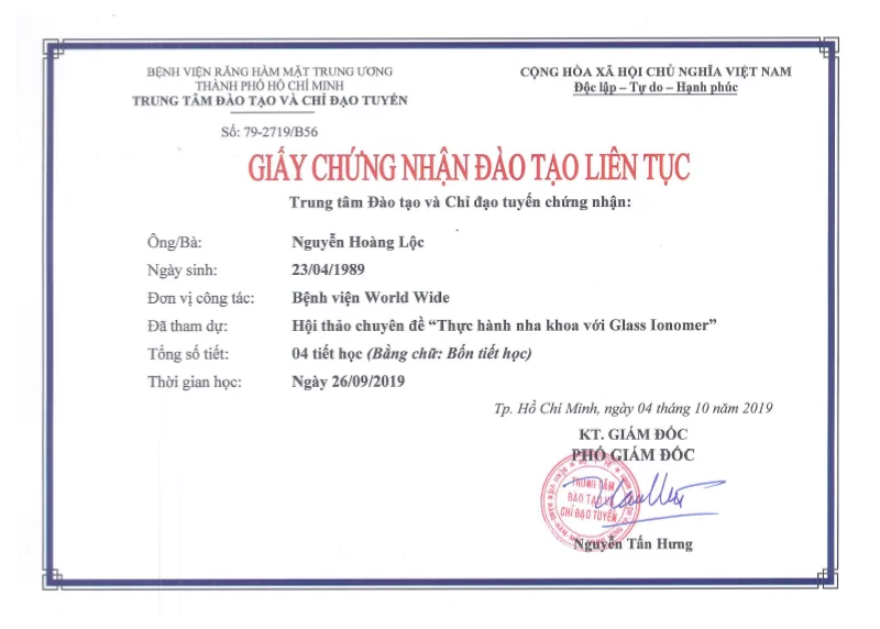 Chính vì thế, trong suốt những năm công tác tại Kubet Worldwide, bác sĩ Lộc đã điều trị thành công cho rất nhiều bệnh nhân, khách hàng. Học hỏi không ngừng từ các đồng nghiệp, tiến sĩ – bác sĩ Đỗ Đình Hùng, cùng những hội thảo răng hàm mặt trên thế giới. Với năng lượng, nhiệt huyết và niềm đam mê dồi dào của tuổi trẻ, bác sĩ Lộc đã tiến rất xa về mặt kiến thức và chuyên môn. Một điều mà bạn sẽ không tin được nếu chỉ mới tiếp xúc với bác sĩ Lộc ít lâu.