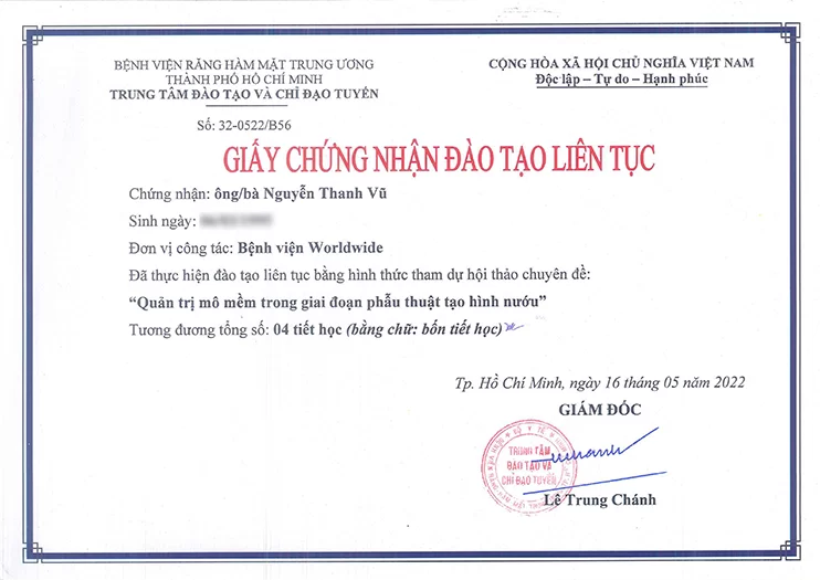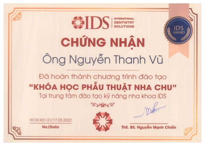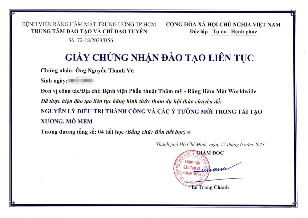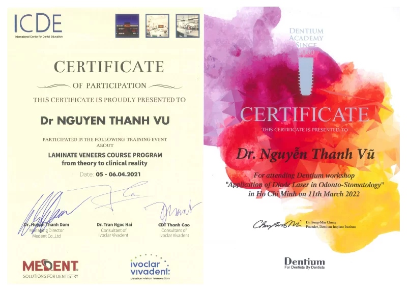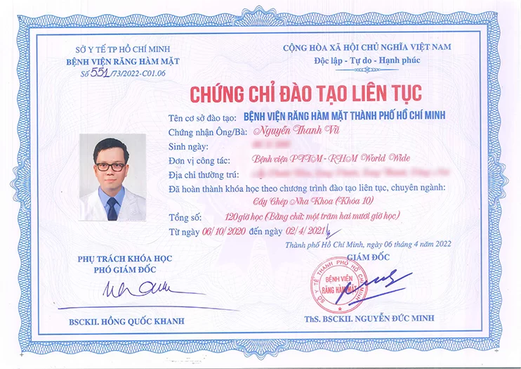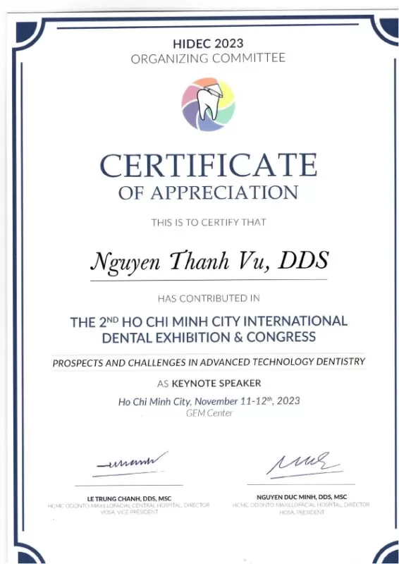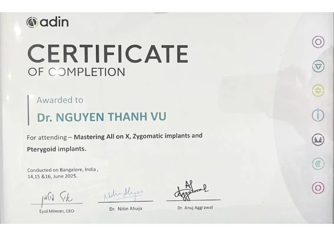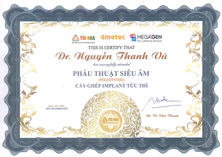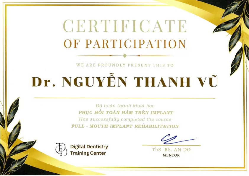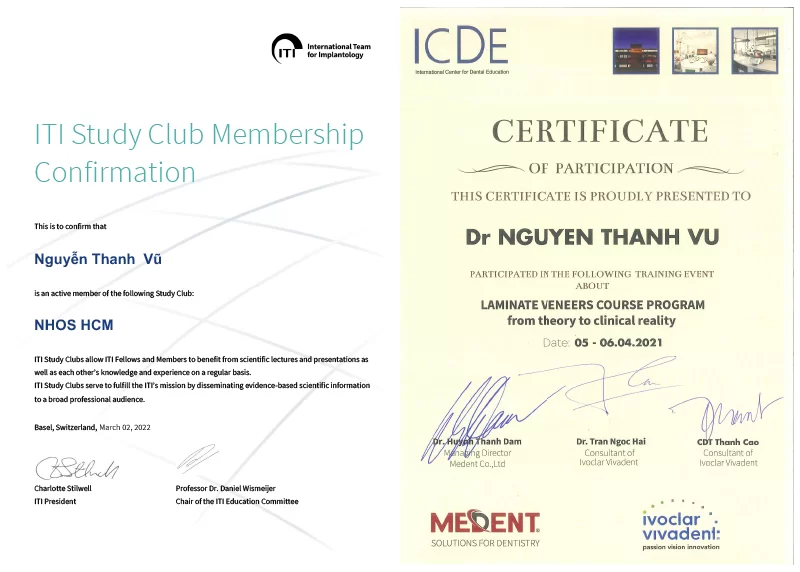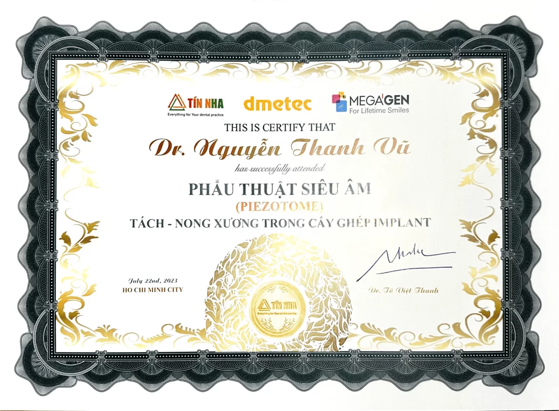 Để đảm bảo việc điều trị được thực hiện một cách hiệu quả và an toàn nhất, Bs. Vũ không ngừng nỗ lực để cập nhật kiến thức mới nhất, cả trong và ngoài nước. Đồng thời, Bs. Vũ còn là thành viên tích cực của các tổ chức uy tín như Hiệp hội Implant nha khoa quốc tế (International Team for Implantology – ITI), Hiệp hội Implant nha khoa Hoa Kỳ (American Academy of Implant Dentistry – AAID). Đặc biệt, kinh nghiệm thực tế của Bs. Vũ được củng cố thông qua thời gian tu nghiệp tại Northwest Implant Center và TC Dental Lab (Oregon, Hoa Kỳ) chuyên sâu về Implant kỹ thuật số.
