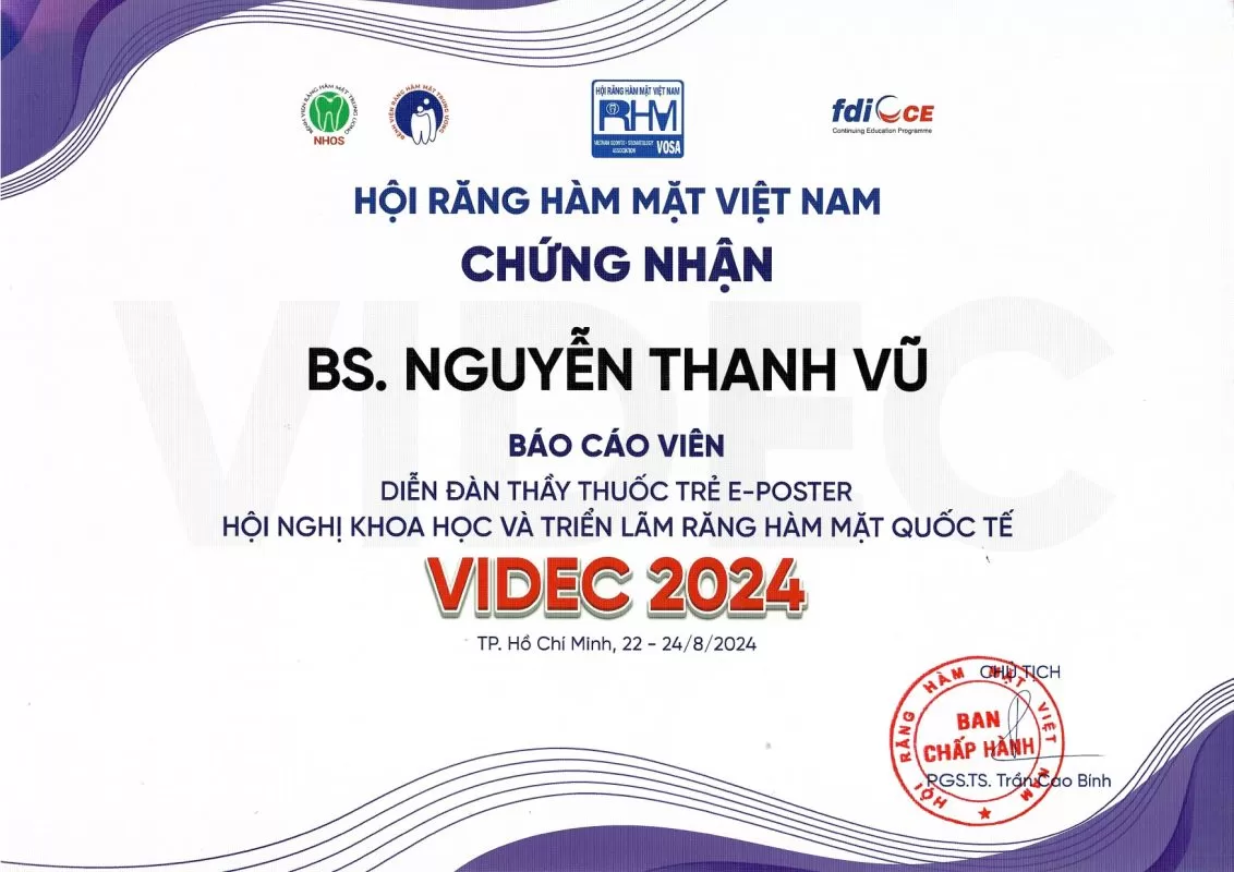 Tại ĐHYD TP. HCM, Bs. Vũ thực hiện đề tài thạc sĩ về implant KTS. Anh không chỉ chia sẻ những kiến thức từ nghiên cứu của mình mà còn tích cực hợp tác và trao đổi kinh nghiệm với đồng nghiệp, nhằm nâng cao chất lượng điều trị.