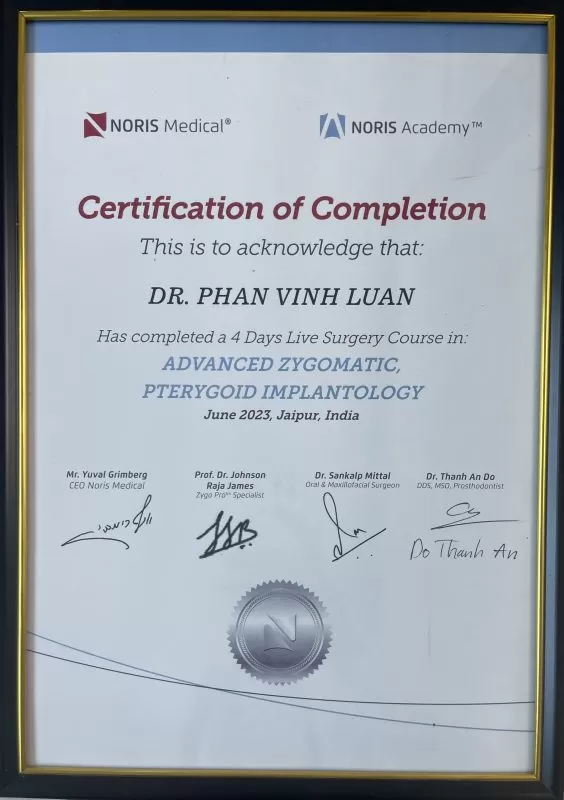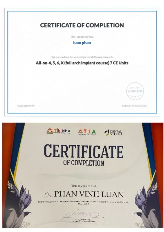 - Chứng chỉ quản lý biến chứng quanh implant với Giáo sư Shih-Chang Tseng tại Mỹ.