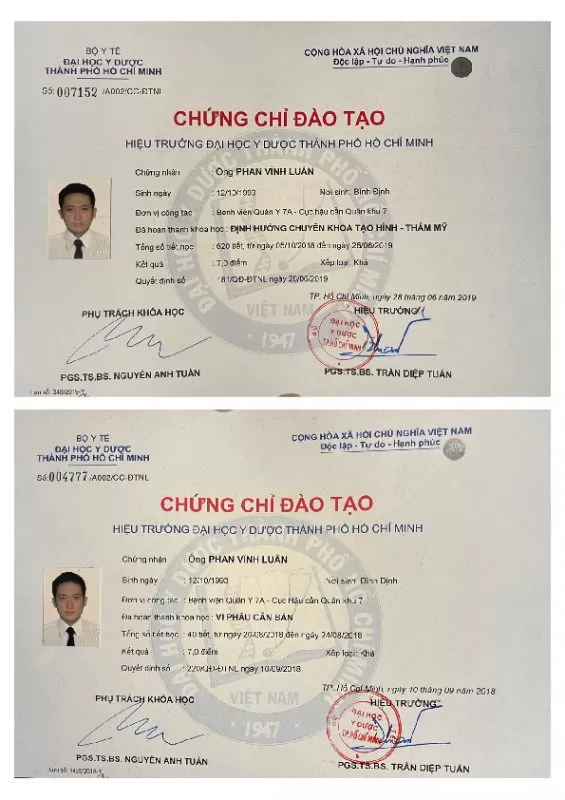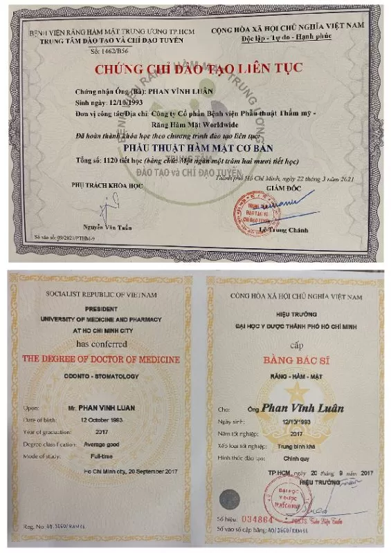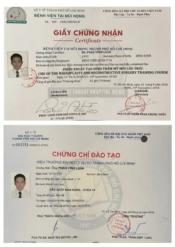- Chứng chỉ ghép xương nâng cao theo chiều đứng với Giáo sư Istvan Urban tại Mỹ.